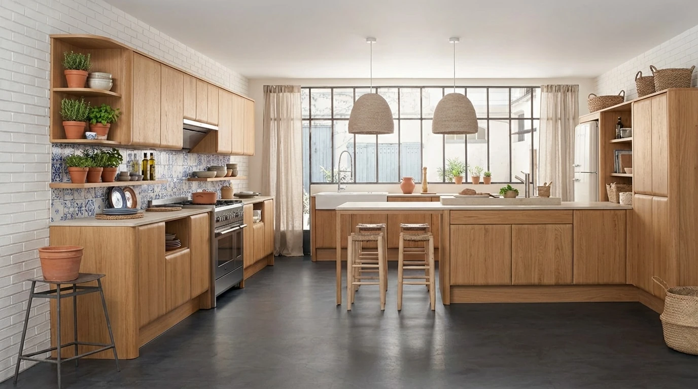 - Scandinave : Bois clair, tons pastels, épuré (idéal pour les petits espaces).