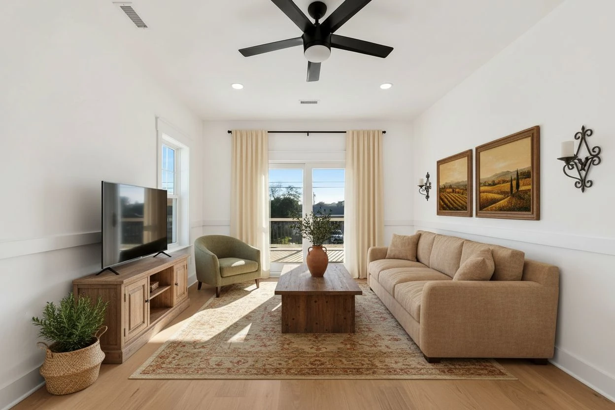 - Le salon/séjour : C'est la pièce de vie principale. L'acheteur doit s'y voir recevoir ses amis ou se détendre. Une mise en scène chaleureuse est indispensable.